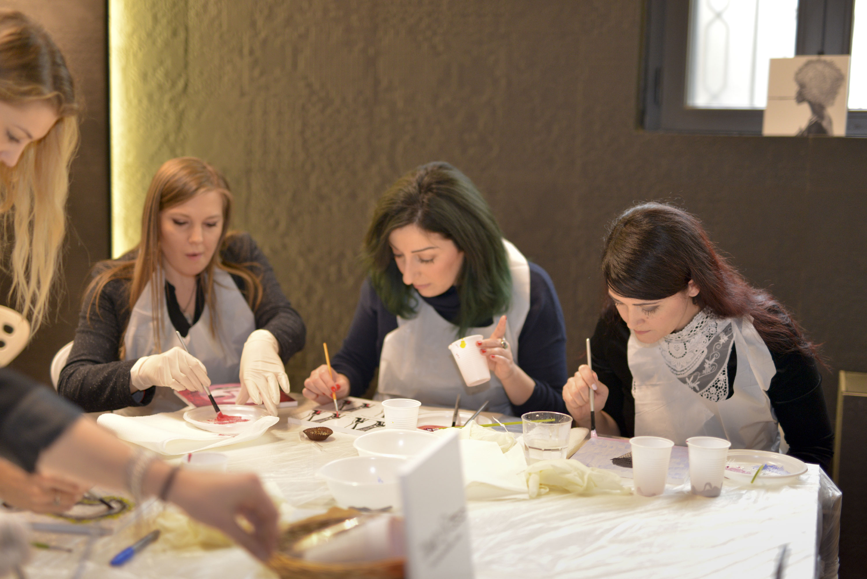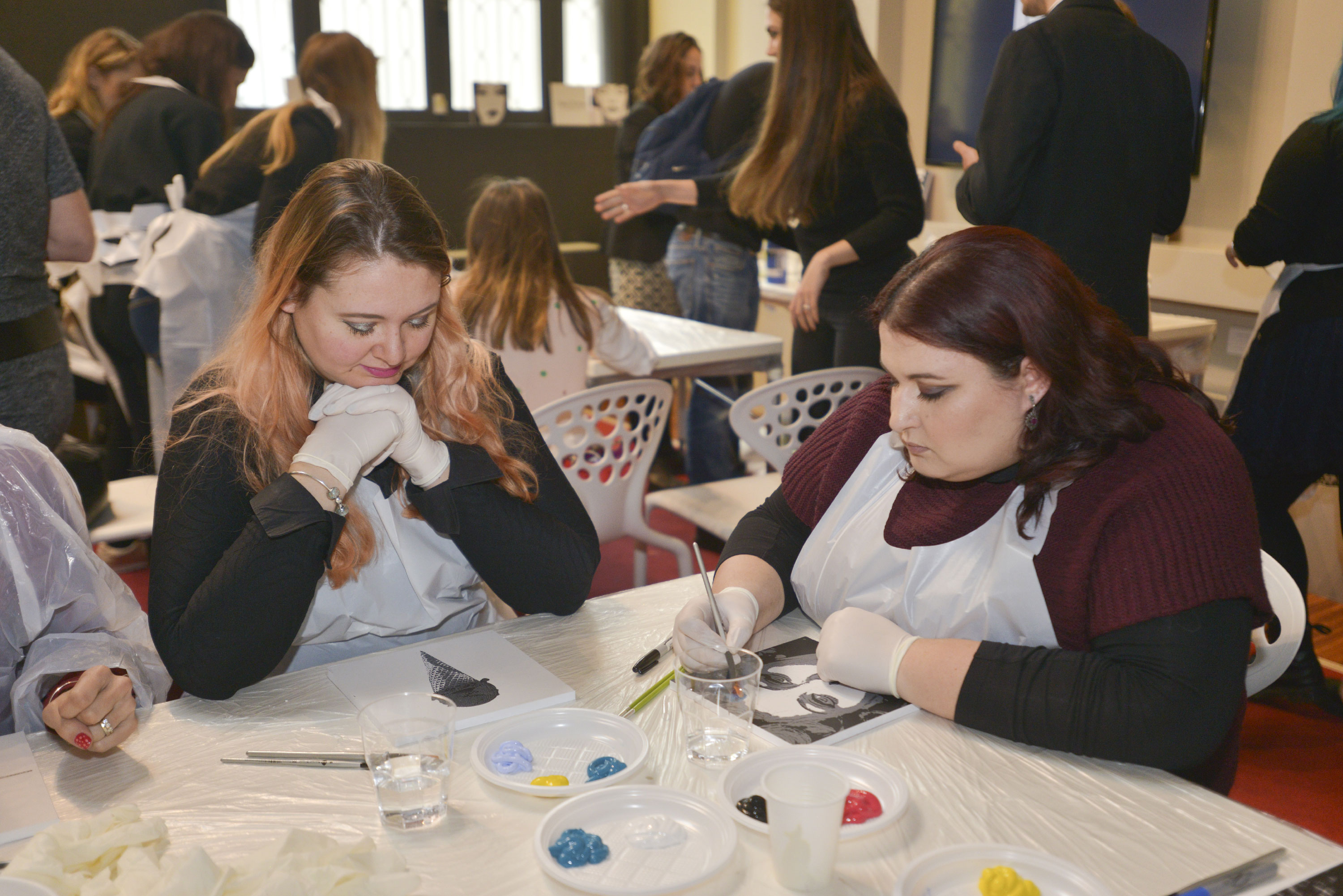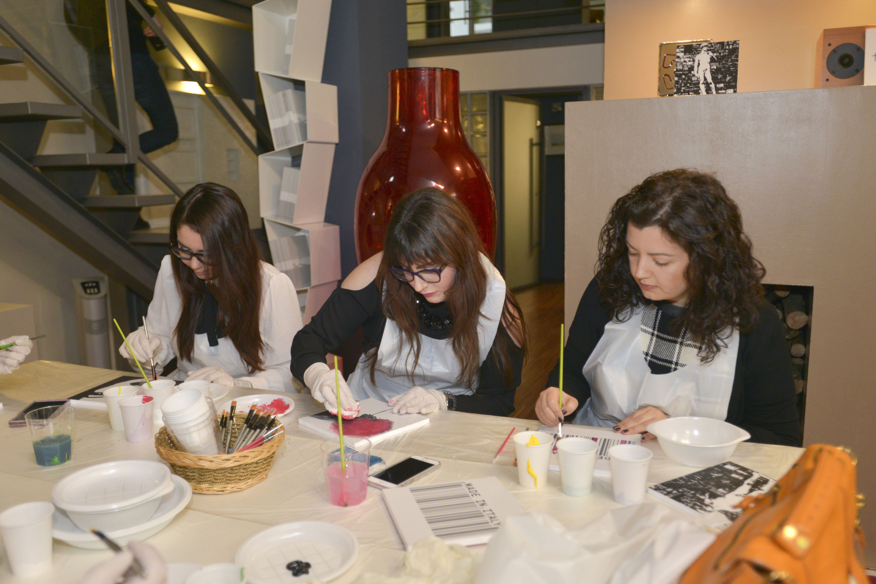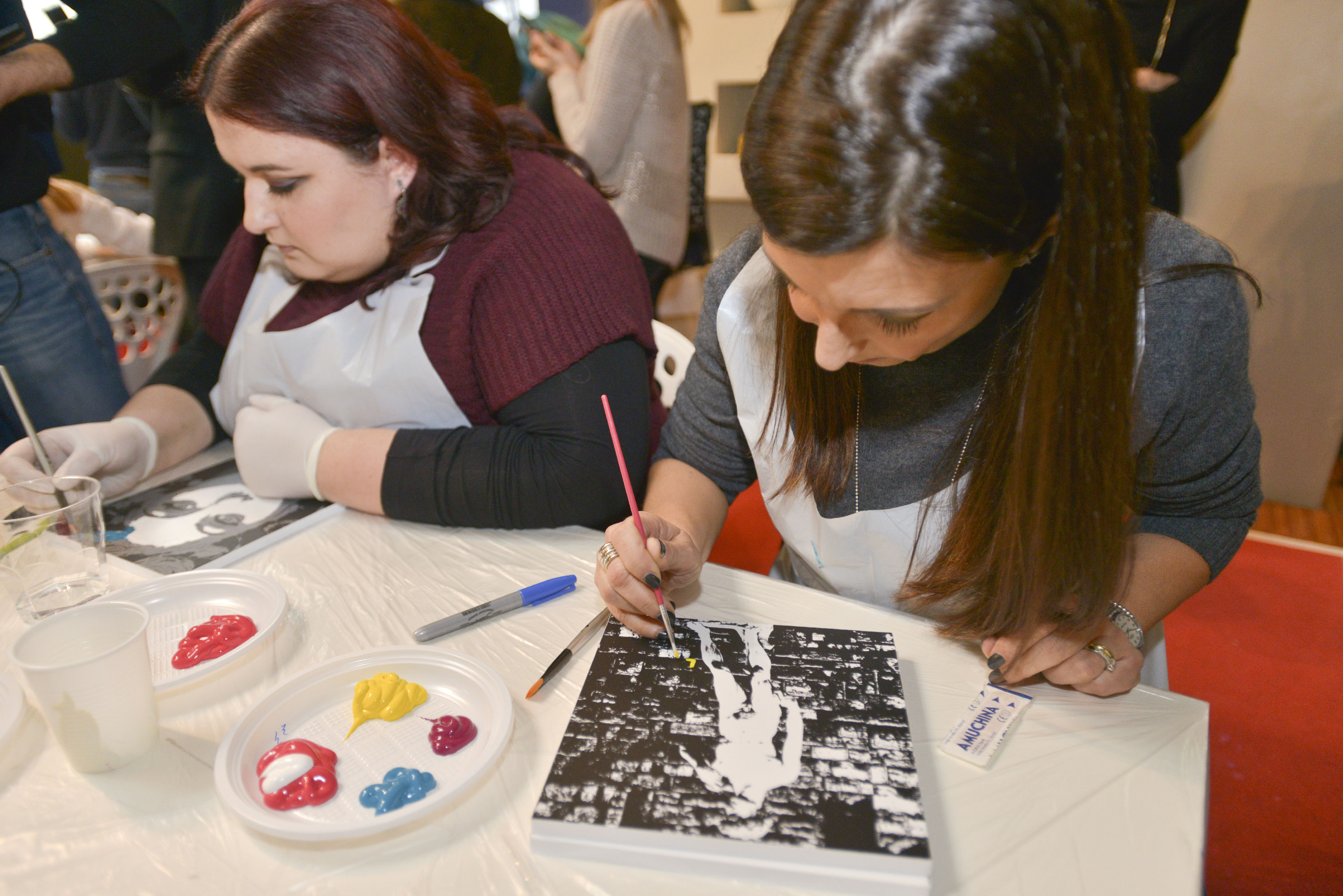 Tavolette con disegni base vari, in bianco e nero, pennelli e colori, libera ispirazione e spazio alla fantasia per realizzare le nostre personali interpretazioni d’arte. Mi sentivo come una bimba al parco giochi: grembiule, veloce, scelgo due soggetti da decorare perché ho due idee, pennello, colori (solo quelli base della collezione #tiamo500 perché una delle mie idee ha una sua logica).