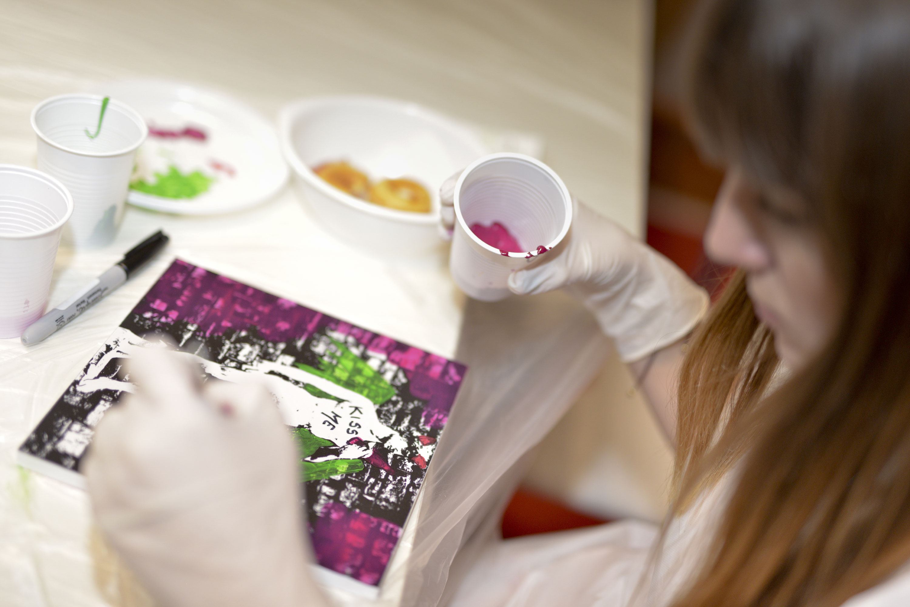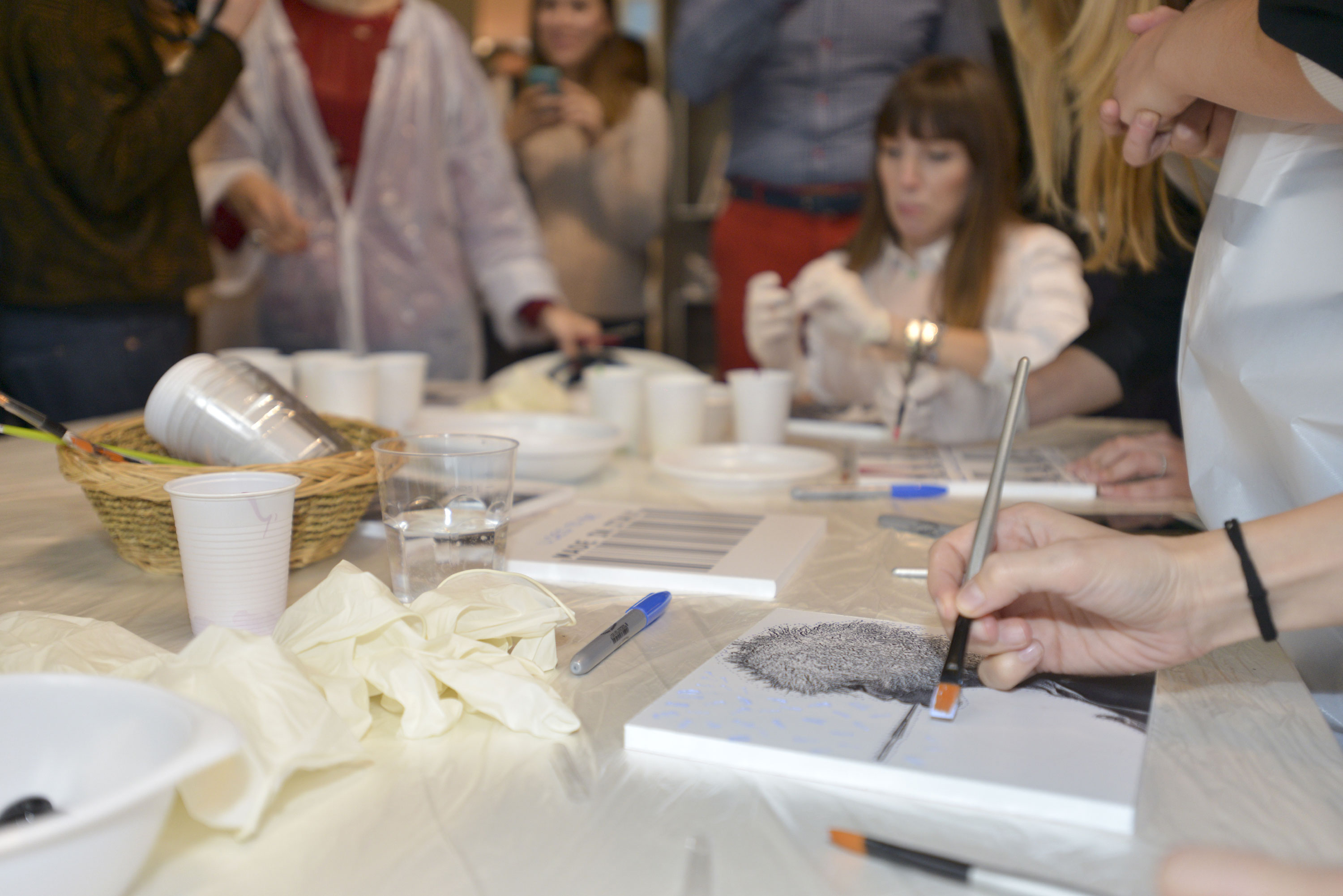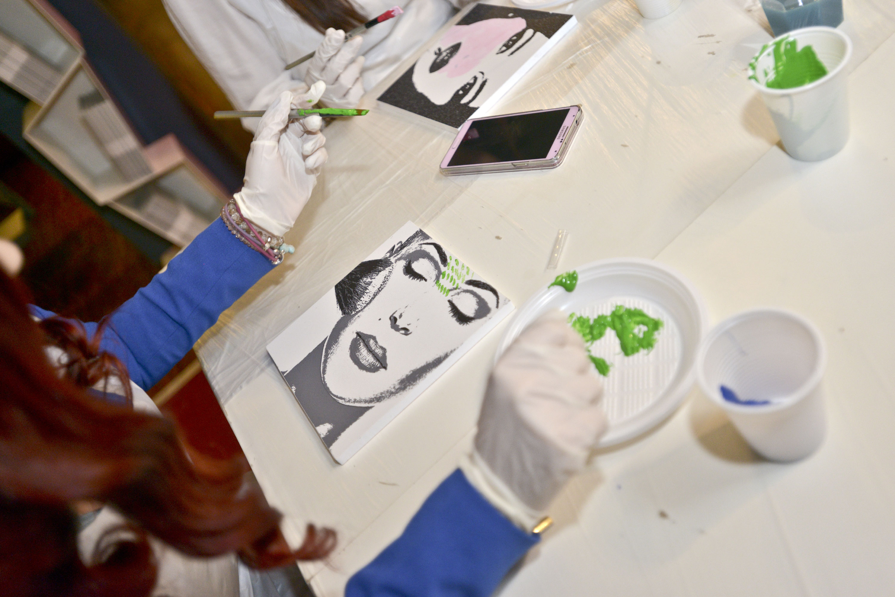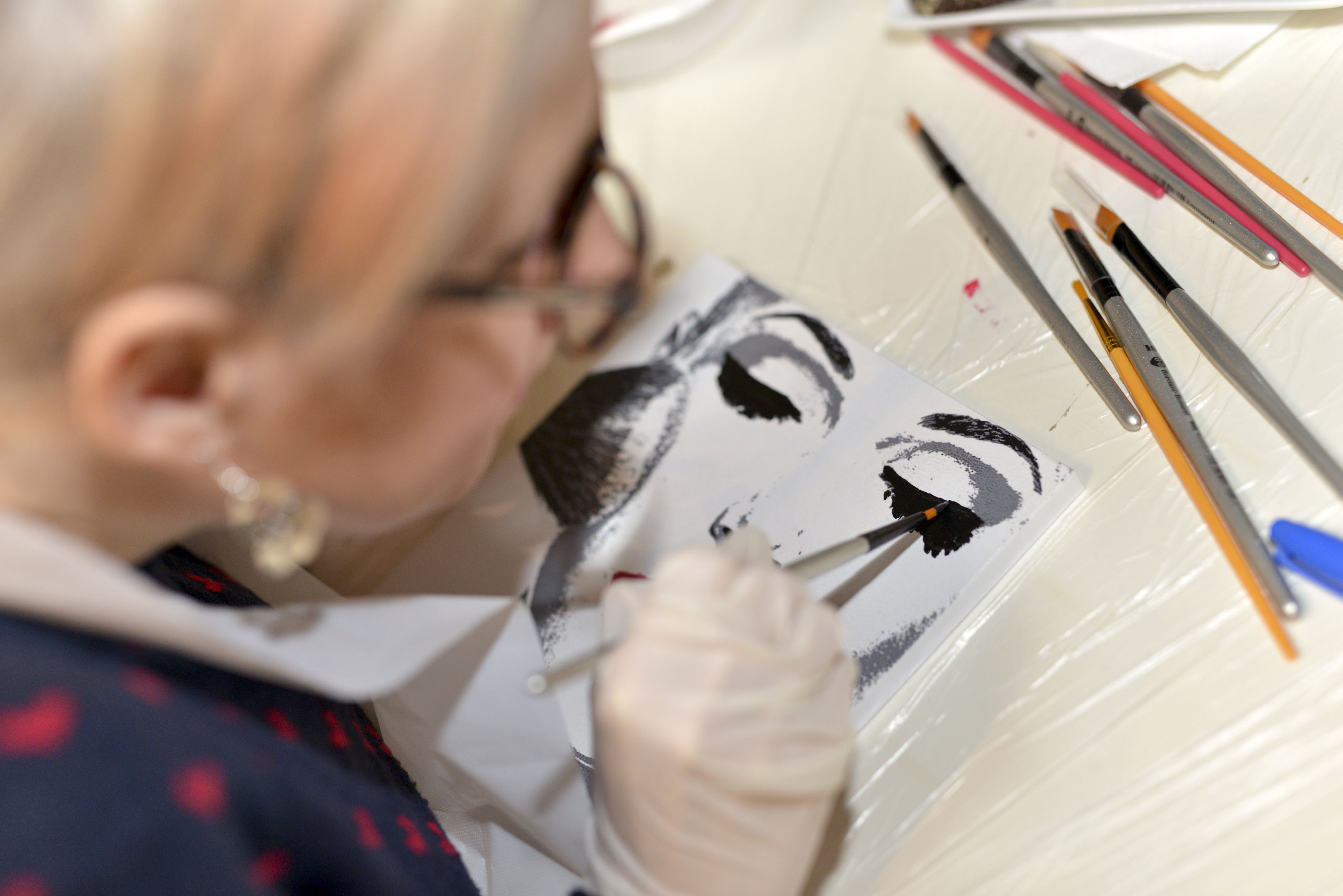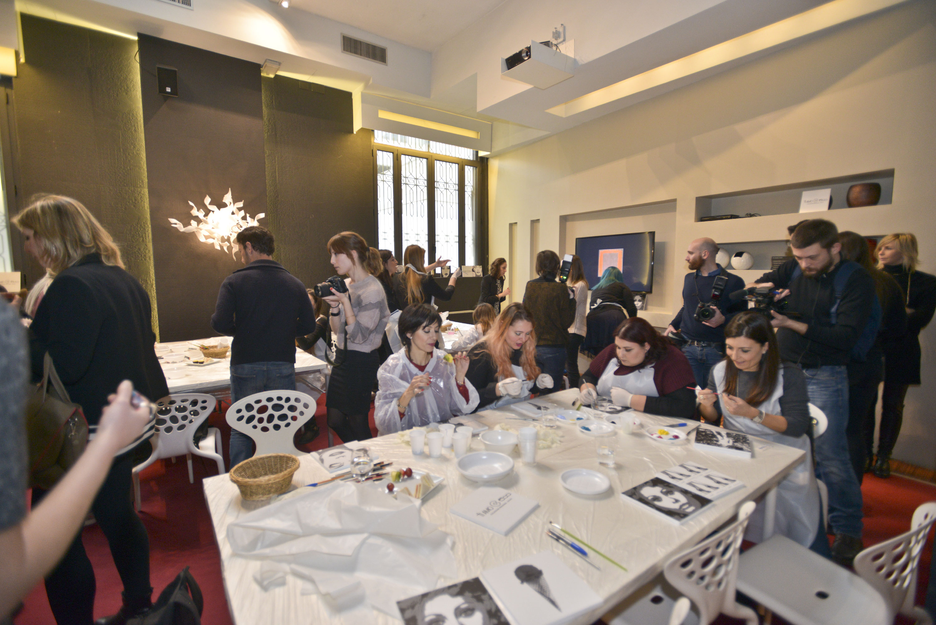 Tavolette con disegni base vari, in bianco e nero, pennelli e colori, libera ispirazione e spazio alla fantasia per realizzare le nostre personali interpretazioni d’arte. Mi sentivo come una bimba al parco giochi: grembiule, veloce, scelgo due soggetti da decorare perché ho due idee, pennello, colori (solo quelli base della collezione #tiamo500 perché una delle mie idee ha una sua logica).