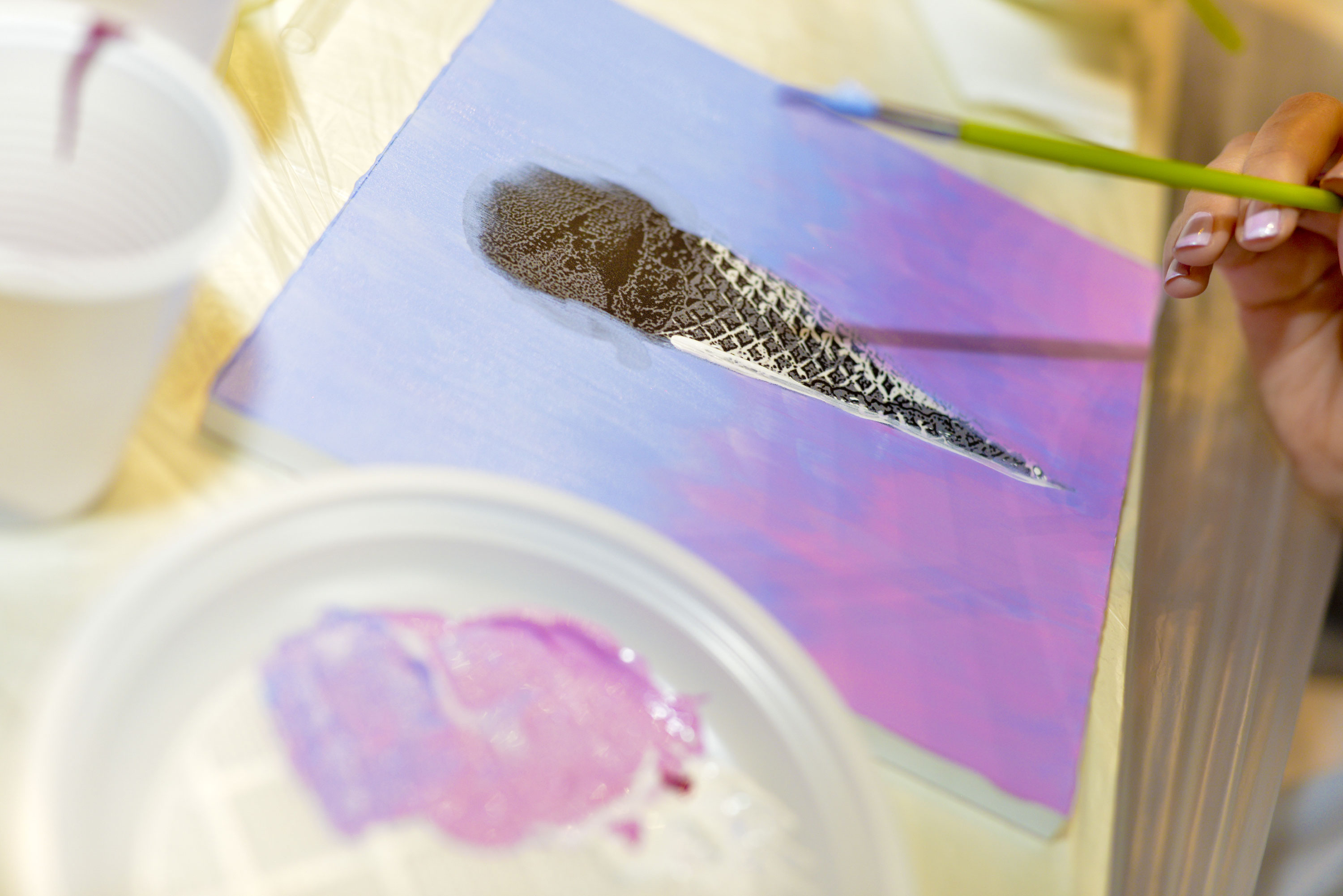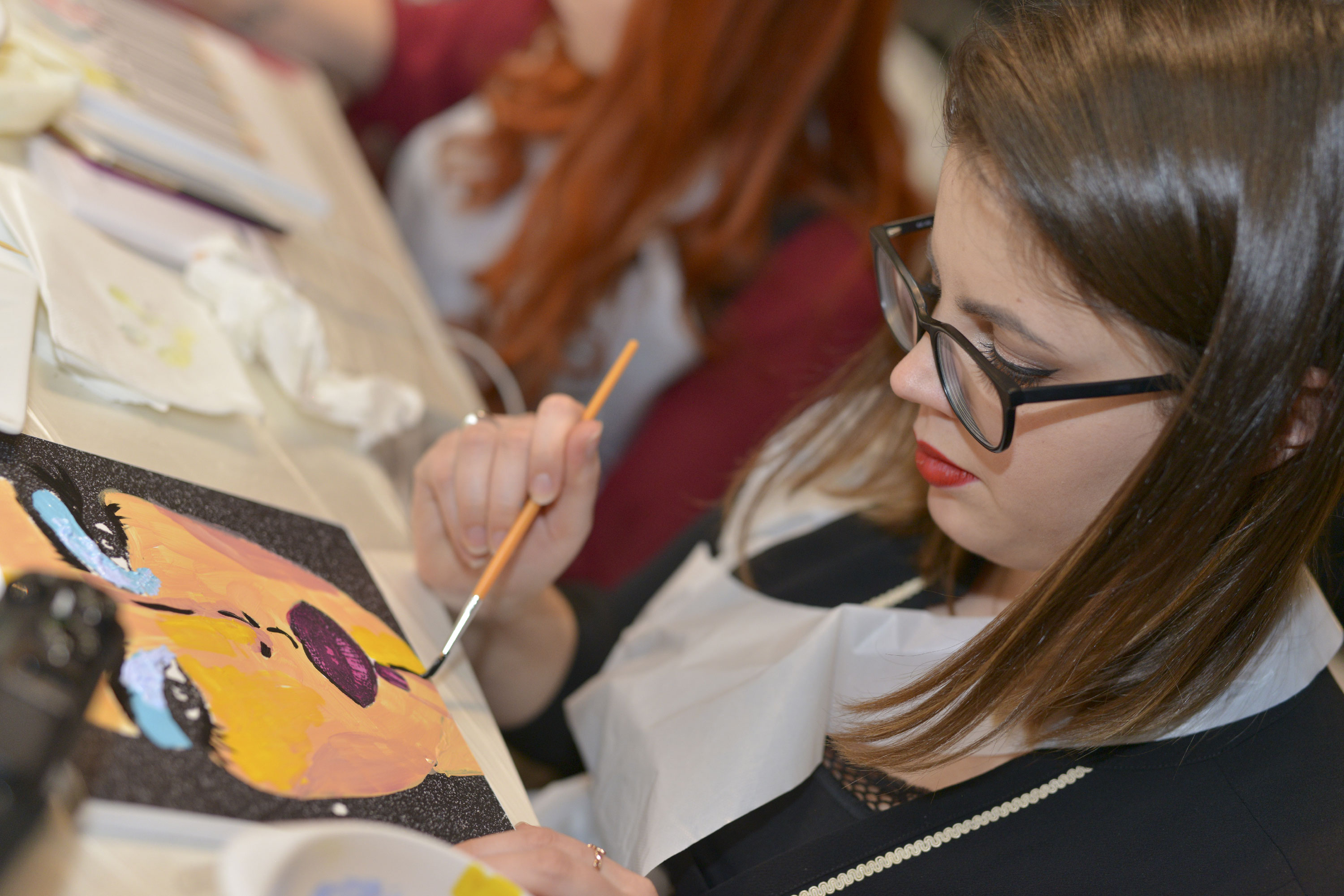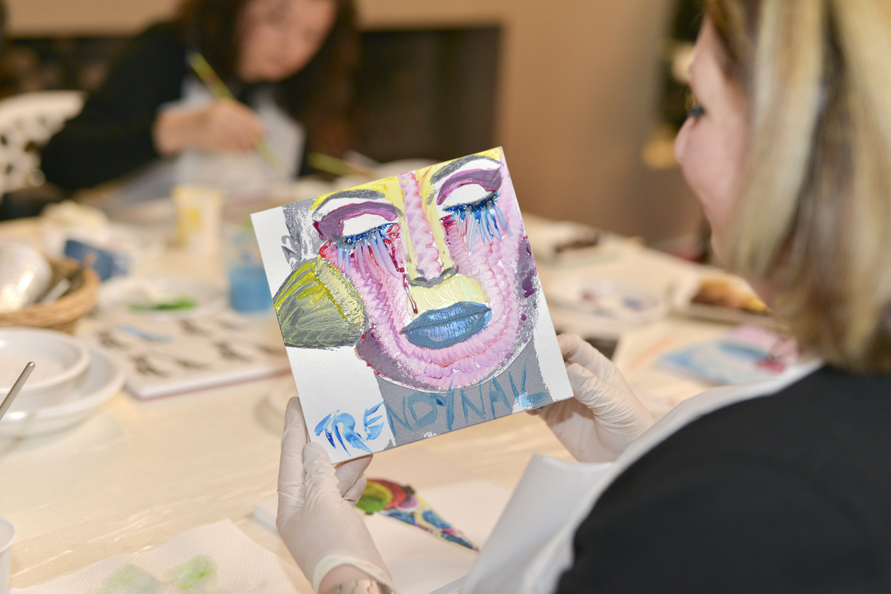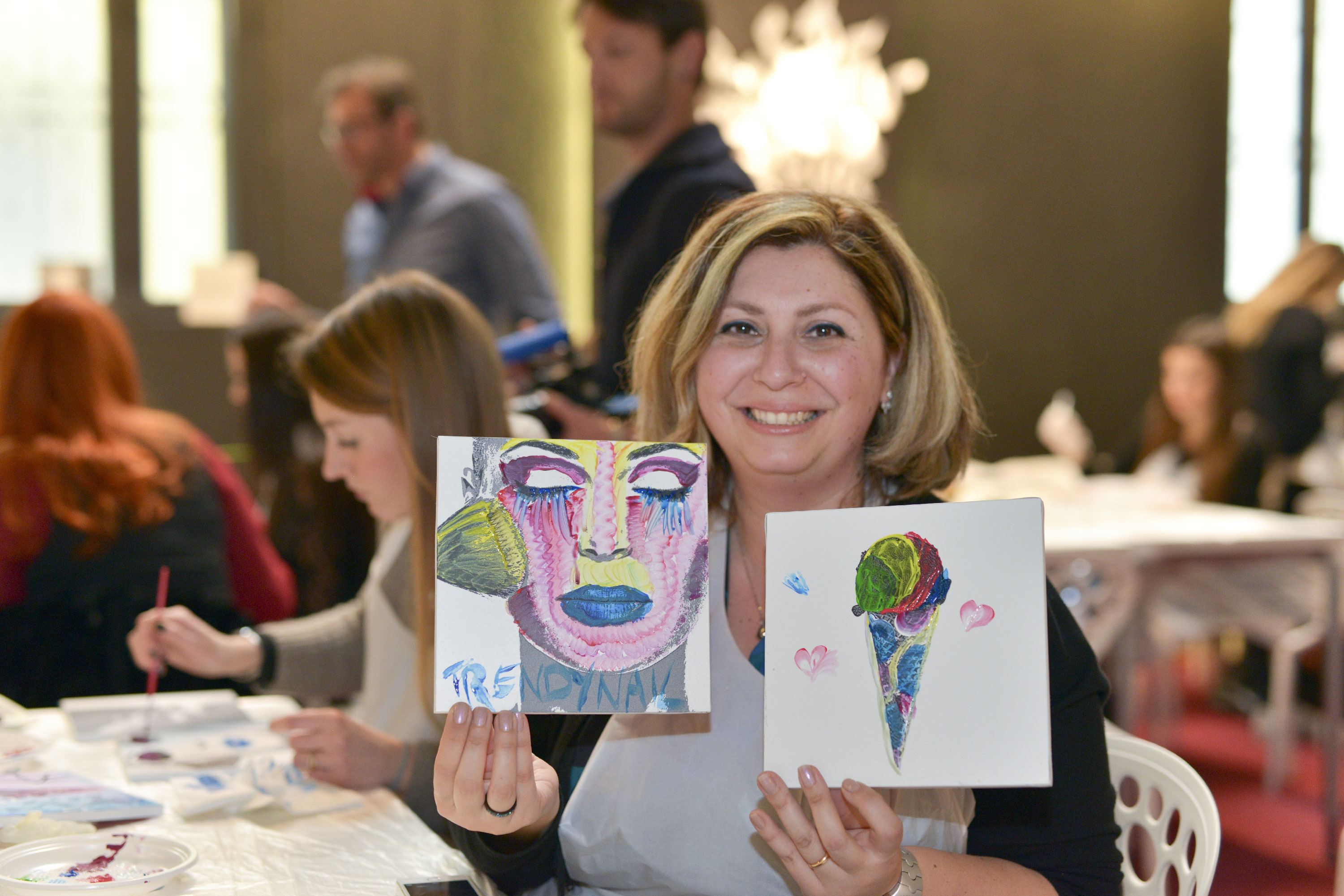 Tavolette con disegni base vari, in bianco e nero, pennelli e colori, libera ispirazione e spazio alla fantasia per realizzare le nostre personali interpretazioni d’arte. Mi sentivo come una bimba al parco giochi: grembiule, veloce, scelgo due soggetti da decorare perché ho due idee, pennello, colori (solo quelli base della collezione #tiamo500 perché una delle mie idee ha una sua logica).