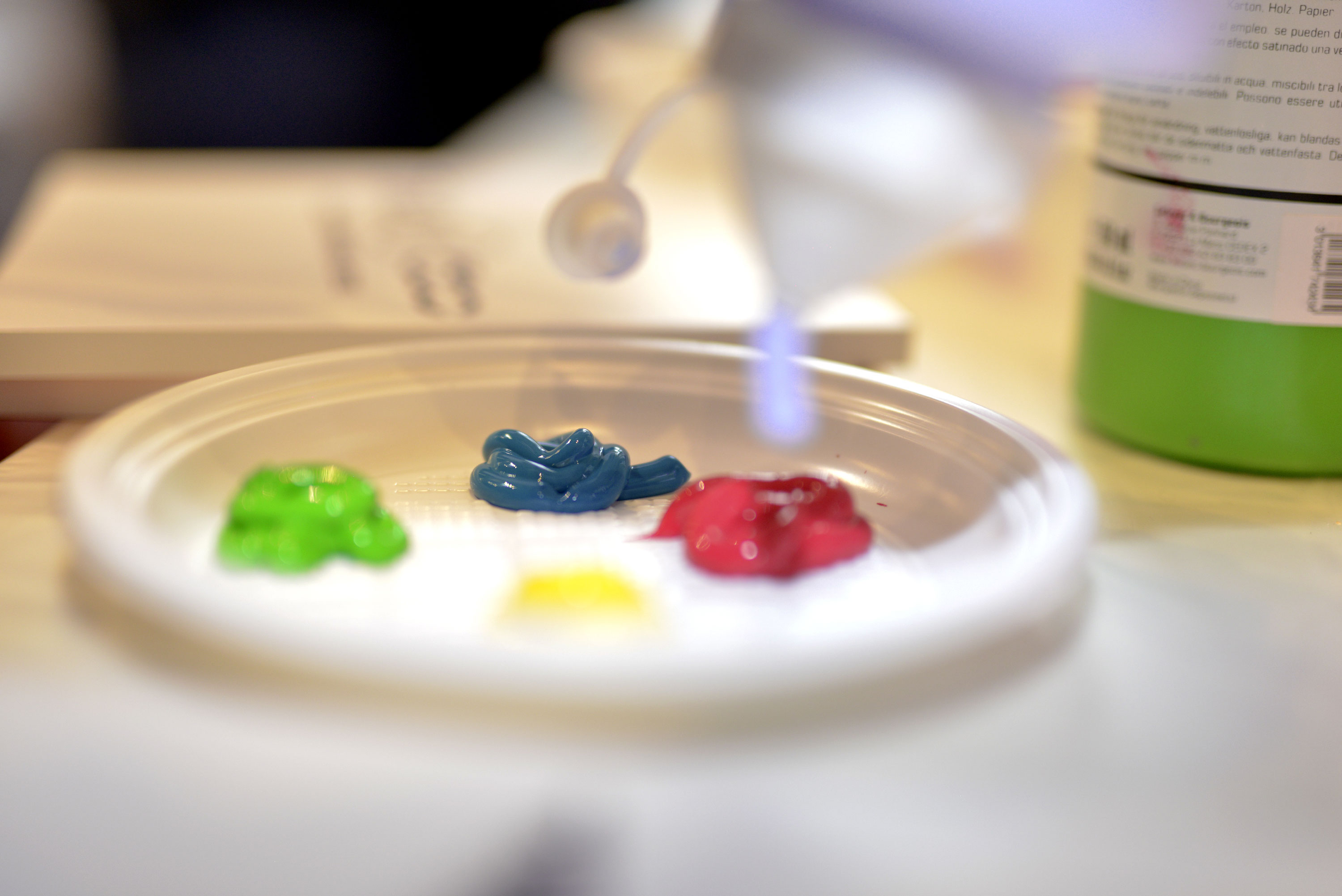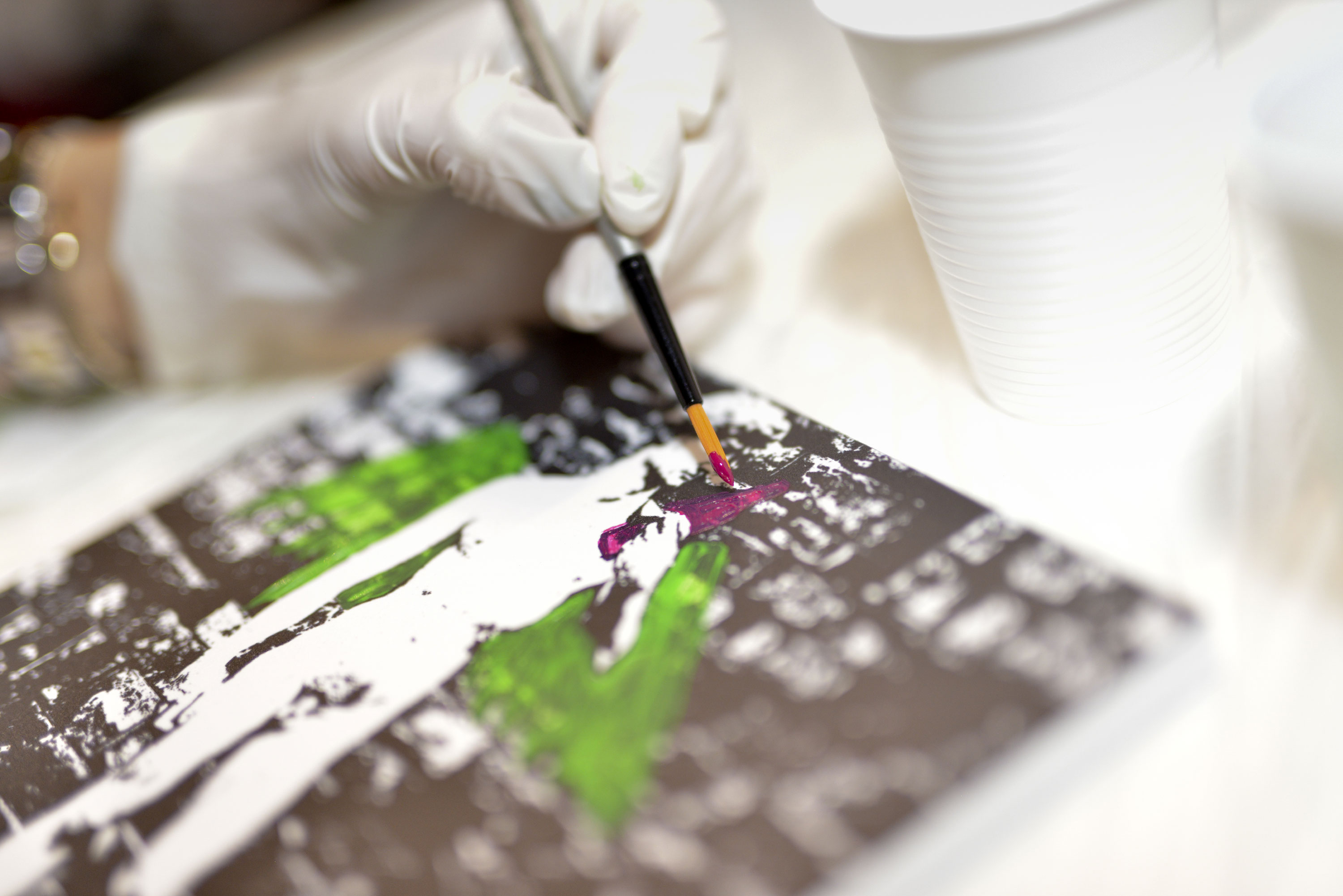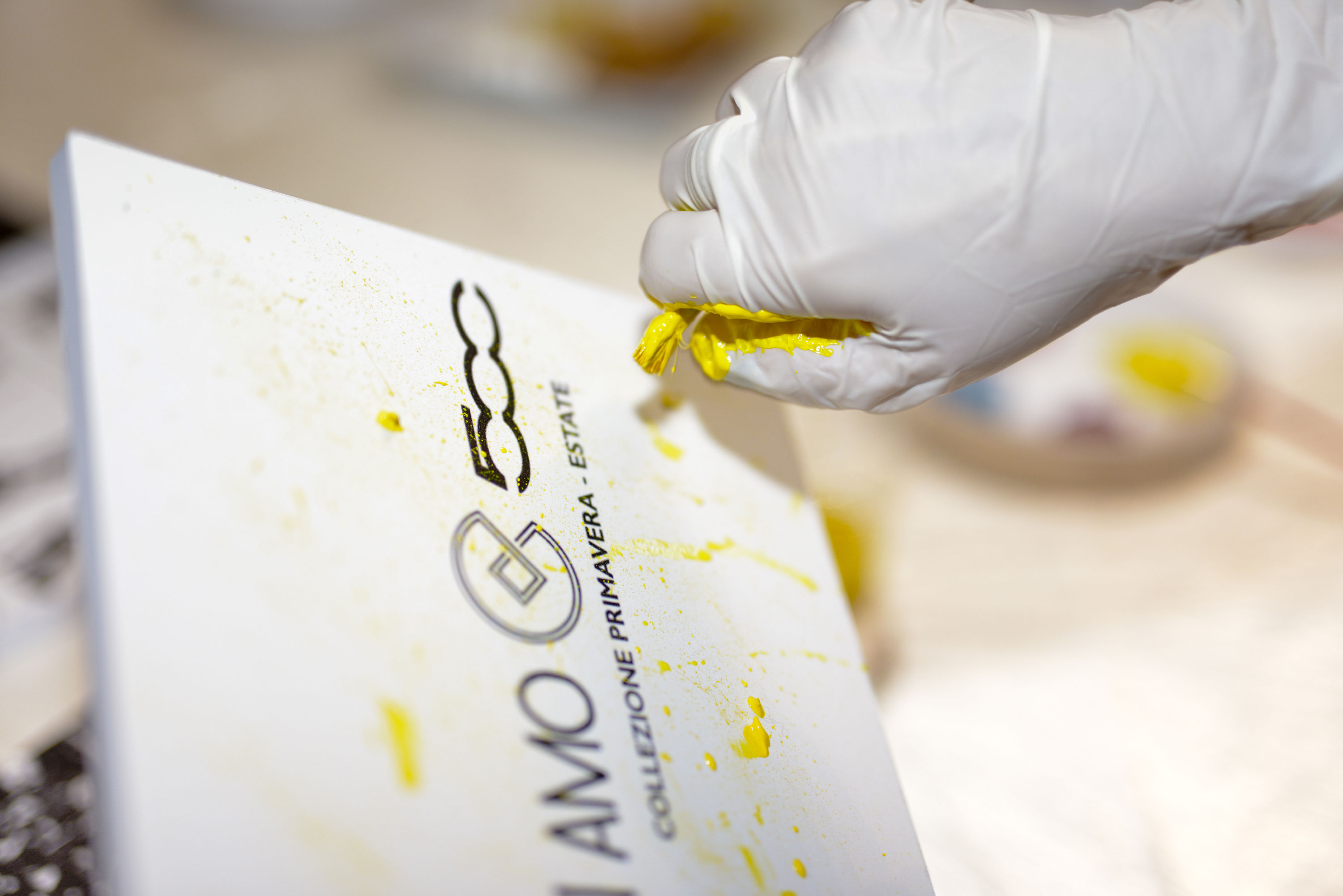 Il primo soggetto è il marchio Collistar; il pennello non mi serve per stendere il colore ma per spruzzarlo sulla tavoletta bianca e ottenere un decoro d’ordine confuso, mille gocce di fucsia accendimi, oro abbagliami, corallo non fermarmi e verde/blu portami via. Realizzo così il mio connubio tra il brand e i colori della collezione.